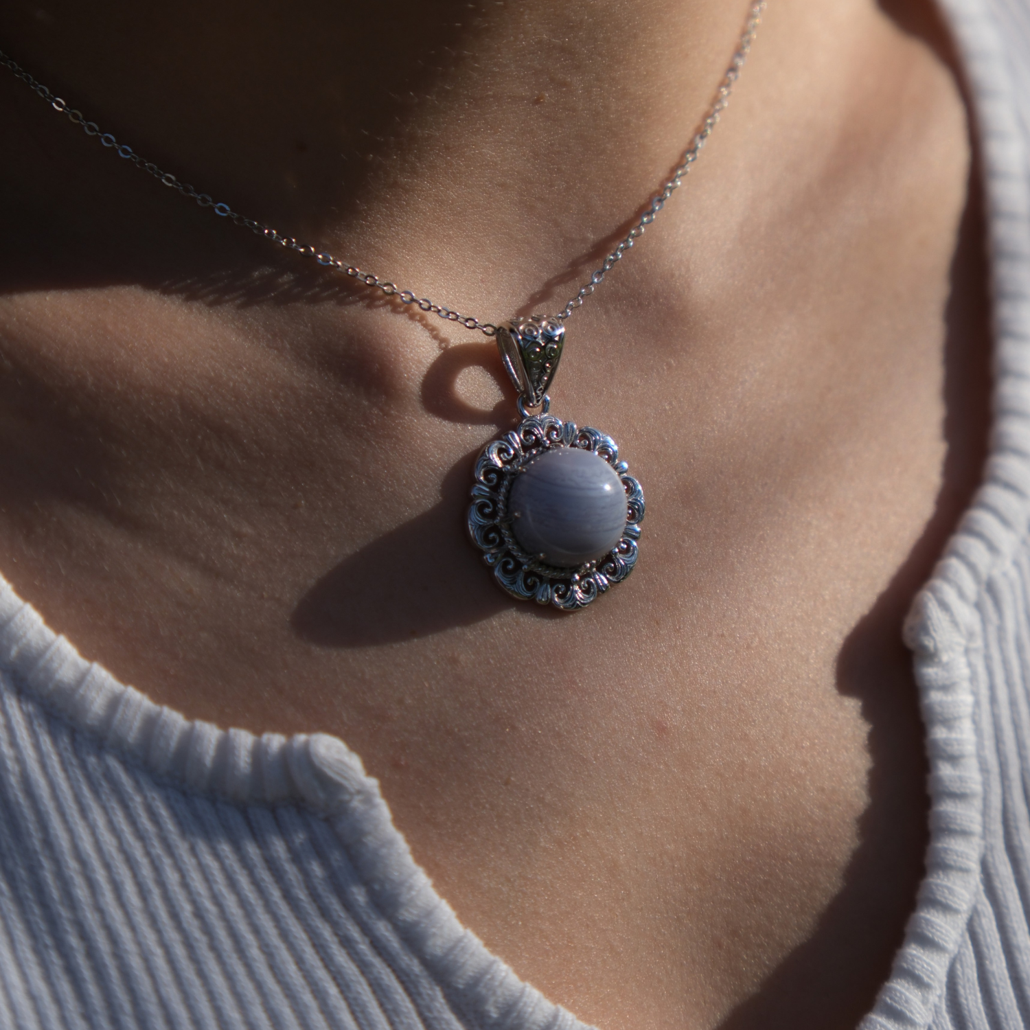 A whisper of ancient skies and forgotten seas, Zephyra centers a natural blue banded agate in a flourish of ornate 925 sterling silver. The gem's gentle striations echo wind-carved stone and drifting clouds, while the filigree setting evokes vintage grandeur with a touch of mythic grace. A piece that feels storied, elegant, grounded, and endlessly evocative.